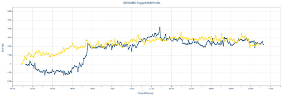 Example of the reproducibility of 24 h intraocular pressure after ripasudil eye drop administration using a CLS. r = 0.841. Blue tracing: first time measurement. Yellow tracing: second time measurement for reproducibility exam.