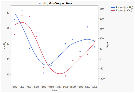 The correlation between CLS IOP and tonometry IOP remains controversial [11,12,13]. In order to measure the IOP (mmHg) in the supine position in the sleep time, we used an i care ic200 to measure the 24 h IOP fluctuation every 2 h in two patients. A sample of CLS IOP (mVeq) and ic200 IOP (mmHg) measurements in a participant after ripasudil eye drops administration is presented in Figure 4. The mean Pearson’s correlation between CLS IOP and ic200 IOP was r = 0.464. However, we could not compare the correlation value with the results of the previous studies directly, due to the different tonometry methods used. The ratio of the circadian fluctuation of IOP measured by the ic200 and IOP measured by the CLS were calculated and presented in Table 4. The ratio between the two cases were similar.