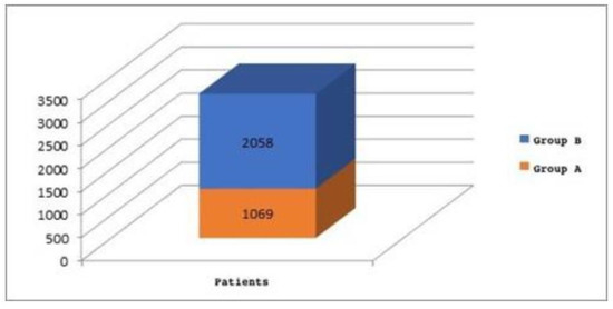 Consequently, 1069 patients (Group A), corresponding to 34% of the total sample, underwent intracapsular tonsillotomy, and 2058 patients (Group B), corresponding to 66% of the total sample, underwent extracapsular tonsillectomy (Figure 2).