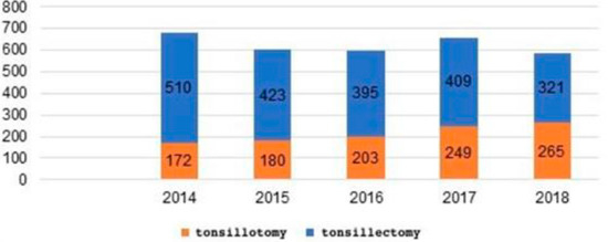 - Parker, N.P.; Walner, D.L. Trends in the indication for pediatric tonsillectomy or adenotonsillectomy. Int. J. Pediatr. Otorhinolaryngol. 2014, 78, 2151–2155. [Google Scholar] [CrossRef]