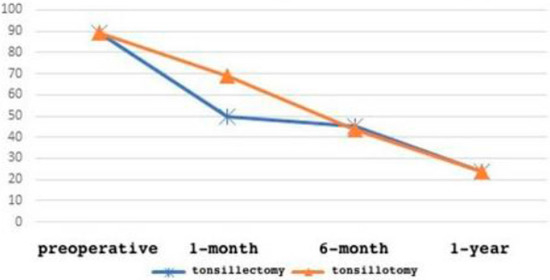 In this case, patients were re-evaluated by an otolaryngologist through upper respiratory tract endoscopy and OSA-18 survey 1 month, 6 months, and 1 year after the surgery, and a new pulse oximetry evaluation was undertaken after 6 months (Table 8).
