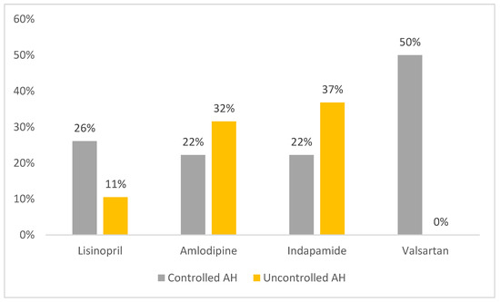 The difference between the proportion of the patients in the group with controlled and uncontrolled AH, in whose blood at least one AHD was not found, was not statistically significant (p = 0.318). These results indicate that, regardless of BP control, at least 30% of patients with AH, taking AHD (lisinopril, amlodipine, valsartan, indapamide), do not achieve therapeutic concentrations, which is a potential opportunity to increase the effectiveness of the therapy.
