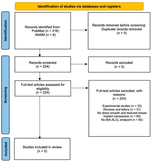 The initial literature search yielded 216 studies in PubMed and 8 of the ANSM reference list. Ultimately, 224 studies out of the total 224 studies were excluded. Articles were excluded according to the prior mentioned exclusion criteria, including experimental studies (n = 33), reviews, letters or commentaries (n = 51), no comparison between smooth and textured implant surface types (n = 80), no BIA-ALCL as a primary endpoint (n = 60), and where the Jones criteria could be applied (required information: implant manufacturer) (n = 0).) After applying our exclusion criteria, no clinical studies have been found to demonstrate a comparison of smooth (Jones surface grade 1) and textured (Jones surface grade 2, 3, or 4) breast implants with clinical outcomes with regard to developing BIA-ALCL. No study was included in the analysis (Figure 1).