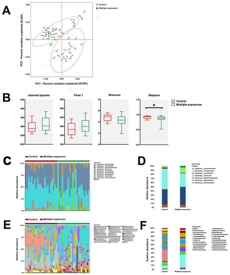 Configuration of the gut microbiome of human fecal pellets. (A) PCoA analysis of weighted UniFrac distance representing beta−diversity of the gut microbiota in children from both the control group (Red) and multiple-exposure group (Green). PCoA plots explain 29.62% and 28.29% of the variance of weighted UniFrac distances from individual subjects. (B) Indices representing the alpha−diversity of the gut microbiota between the two groups. The analysis of α−diversity indices proved no statistical difference between two groups in observed species, Chao 1, and Shannon (Pobserved species = 0.11, PChao1 = 0.09, PShannon = 0.06, p > 0.05), while a significant difference was shown in Simpson (PSimpson = 0.024). *: p < 0.05. Differences can be seen in the microbiota composition at the phylum and family levels in humans (C–F). Bar graphs show the individual child (C) and mean (D) relative abundance of the major phyla in rats of both the control group and multiple-exposure group. Bar graphs show an individual child (E) and mean (F) relative abundance of the major families. Red: control group; Green: multiple-exposure group.