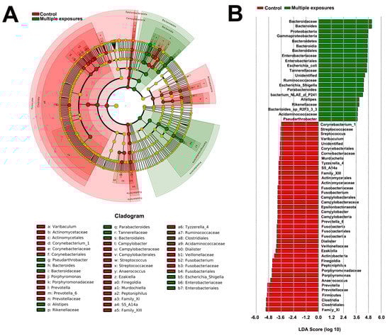 Differentially abundant bacterial taxa between the control group and multiple−exposure group. (A) Cladogram generated by LEfSe indicating differentially abundant bacterial taxa in different phylogenetic levels. Regions in red indicate taxa enriched in the control group while regions in green indicate taxa enriched in multiple-exposure group. (B) LDA scores shown in the bar graph. Bacterial taxa which were significantly enriched in the multiple−exposure group (LDA score > 3.6) or control group (LDA score < −3.6) were detected by LEfSe analysis (p < 0.05).