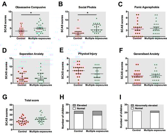 Anxiety status in children tested by SCAS. The scores of obsessive compulsive disorder (A), social phobia (B), panic attacks, and agoraphobia (C), separation anxiety disorder (D), physical injury fears (E), generalized anxiety disorder (F), and the total score (G) were calculated and compared between the control group and multiple-exposure group. The means and standard error for each outcome measure are presented. The number of children with elevated (H) or abnormally elevated scores (I) were also evaluated. *: p < 0.05. Red: control group; Green: multiple-exposure group.