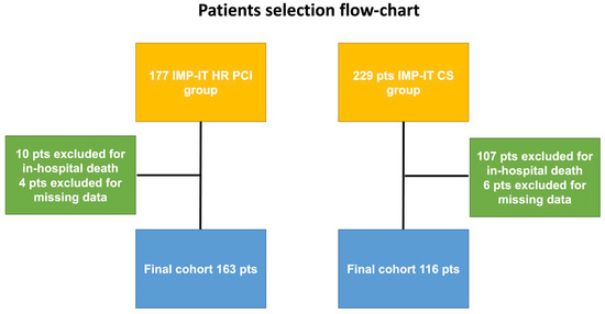 Percutaneous left ventricle assist devices (pLVADs) have been increasingly used to unload the left ventricle while maintaining systemic and coronary perfusion in cardiogenic shock (CS) and to provide adequate hemodynamic support during the high-risk percutaneous coronary intervention (HR PCI). The available devices include an intra-aortic balloon pump (IABP), Impella, and venoarterial-extracorporeal membrane oxygenation (VA-ECMO). Unlike long-term LVADs, they are placed percutaneously and provide support from a few hours up to a maximum of 1 month [1]. Although data from the literature report no significant difference in terms of short-term mortality when comparing the pLVAD to the intra-aortic balloon pump (IABP) in the setting of cardiogenic shock [2], a recent meta-analysis suggested that survival may improve in patients supported with Impella, especially when early placement of mechanical circulatory support is guaranteed [3]. In the high-risk PCI scenario, the PROTECT I and II (A Prospective, Randomized Clinical Trial of Hemodynamic Support With Impella 2.5 Versus Intra-Aortic Balloon Pump in Patients Undergoing High-Risk Percutaneous Coronary Intervention) randomized controlled trials (RCTs) evaluated the effectiveness of hemodynamic support in HR PCI and did not report a reduction of major adverse cardiovascular events (MACE) at 30 days [4,5]. Nevertheless, the PROTECT III study, a prospective, single-arm, post-approval study for Impella 2.5 and Impella CP in HR PCI, brought more insight into this field. Accordingly, a comparative analysis recently demonstrated an improvement in clinical outcomes and left ventricle ejection fraction (LVEF) recovery in patients undergoing HR PCI with contemporary practice [6]. Previous studies, especially in the context of chronic coronary syndromes and left ventricular dysfunction (LVD), demonstrated that the increase of LVEF after surgical coronary revascularisation guided by viability state [7] was not associated with improved survival. While LVEF recovery as a marker of better clinical outcomes has been questioned in this scenario, RCTs are often challenging. Therefore, analyses from large multicentre registries such as the IMP-IT [8] offer the opportunity to obtain more insight into the risk–benefit trade-off [9,10,11]. Accordingly, the aim of this IMP-IT sub-analysis is to evaluate the impact on outcomes of in-hospital LVEF recovery in both CS and HR PCI.
