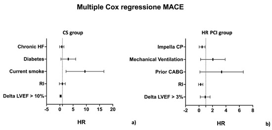 Multiple Cox regression for MACE in the CS group (Panel (a)) and HR PCI group (Panel (b)).