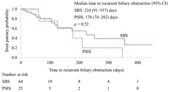 The RBO rates in the SBS and PSIS groups were 32.8% and 28.0%, respectively (p = 0.66). Stent occlusion was the only cause of RBO, and there were no cases of stent migration. The median cumulative TRBO in the effective drainage cases was 224 and 178 days in the SBS and PSIS groups, respectively (p = 0.52) (Figure 2).
