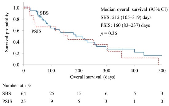 The re-intervention rates in the SBS and PSIS groups were 31.2% and 28.0%, respectively (p = 0.76). The technical success rates of the first re-intervention were 90.0% and 100% in the SBS and PSIS groups, respectively (p = 0.38). The median procedure time of the first re-intervention was 39 and 37 min in the SBS and PSIS groups, respectively (p = 0.76). The median overall survival was 212 and 160 days in the SBS and PSIS groups, respectively (p = 0.36) (Figure 3).