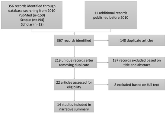 This systematic review found a total of 367 possible articles, reducing them to 14 studies at the end of the process (Figure 1). The total of 367 articles was obtained from PubMed (n = 150), Scopus (n = 194), Google Scholar (n = 12), and other search sites other than the above (n = 11).