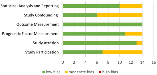 Using the QUIPS tool, a quality assessment of the 14 studies has been carried out. Table 6 summarizes the risk level for each QUIPS section, where: