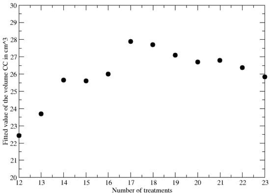 The difference in behavior between PR and CR patients is so strong that the question arises if the late response to the therapy can be predicted on the basis of a limited sequence of early treatments. If this conclusion is supported by data analysis, one could evaluate, with some uncertainty, the time evolution during and after the end of NACRT to obtain some useful information on the best time for surgery. On the other hand, the restriction to a subset of the whole time series requires a criterion to understand the number of data to be used for a reliable prediction. To clarify the adopted heuristic selection method, let us consider, for example, that for a specific patient, the GTV regression data, for NACRT treatments, have been collected during 28 days and that the CC fitted by the complete data series is 20 cm. Let us now fix a subset of data to fit the GL evolution parameters. The data subset cannot be too small for two reasons. The first one is that after a small number of doses, n, the answer is obviously unreliable. The second motivation is more technical and depends on the result (see Appendix A) that the disentanglement between the GL (or the LL) and an exponential regression pattern, which has no finite CC, could require a long enough time series. This problem is more relevant for the complete recovery cases characterized by a very small CC. However, by increasing the number of data, n, to fit the CC, i.e., CC(n), its value will converge to that one obtained by the complete data set. Therefore, by increasing n and comparing CC(n) with CC(), one should observe a convergent behavior with a small difference between CC(n) and CC() for large n. Let us, therefore, assume to take the value of n when the difference between CC(n) and CC() is less than about 10–15% for not very small n (to avoid the two unfortunate reasons mentioned above), and let us compare the CC obtained by this method (Table 2) with its value corresponding to the whole data set (Table 1). The application of this analysis to a subset of data in ref. [37] gives the result reported in Table 2 and the comparison with the CC of the complete dataset, in Table 1, implies that one can clearly differentiate among PR and CR using about of the total number of treatments.