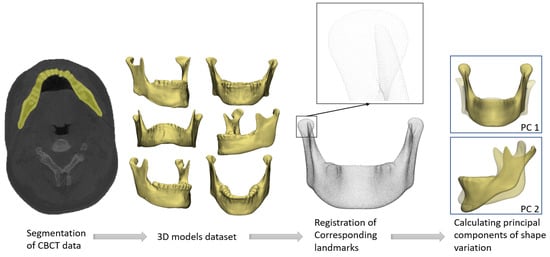 To create a Statistical Shape Model (SSM), the digital 3D models of the mandibles need to be in so-called landmark-correspondence, meaning that all the landmarks have to match each other. Landmark-correspondence between all the mandibles was achieved by registering a template to each mandible using a registration algorithm implemented in MATLAB (MathWorks, Natick, MA, USA) [8]. A dataset was created of evenly distributed landmarks over mandible surfaces. Each landmark’s mean position was calculated to determine the mean mandible model. Using Principal Component Analysis, the principal components (PCs) of shape variation from the mean model were calculated. Figure 1 shows the statistical shape modelling workflow. The shape variation of each PC could be visualized by first plotting the mean shape, and the ±3 standard deviation (SD) in shape, to account for 99.7% of the population. Comparing the resulting images with the mean shape provided an insight into each PC’s anatomical variation.