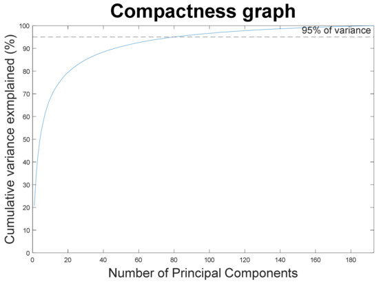 A SSM compactness graph to explain the components after plotting the number of PCs against the cumulative variance. A total of 193 PCs were used in the SSM which, combined, explained 100% of the variance. Only the first 80 PCs were necessary to describe 95% of the variance (dotted line).