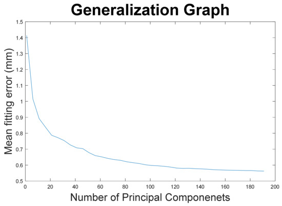 The SSM should be efficient in its description of the shape variation through a minimal number of PCs. A compactness graph was made from the SSM to study how many PCs are needed to describe 95% of the shape variation [9]. To test if we had included enough mandibles to describe the entire orthognathic population, a leave-on-out-cross-validation experiment was performed with 3 mandibles. The results were plotted as a generalization graph to determine if the current study’s results could be generalized to the entire population [9,10].