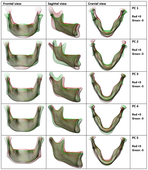 The variations between all 193 PCs were visualized and reviewed, and the first 5 PCs were selected because they demonstrated most of the variance and displayed relevant anatomical variation. Figure 4 shows these first 5 PCs of orthognathic mandibular shape variation. The first and, therefore, most prevalent component of variation mainly describes the height of the vertical dimensions of the mandibular ramus and condyles. The second component mainly describes variation in the gonial angle of the mandible. The third component describes the width of the ramus and the anterior/posterior projection of the chin quite well. The fourth principal component mainly describes the lateral projection of the angle of the mandible. The fifth descriptive principal component of variation seems to be mainly the lateral slope of the ramus and the inter-condylar distance, varying between a ‘V-shaped’ mandible and a ‘Rectangular-shaped’ mandible.