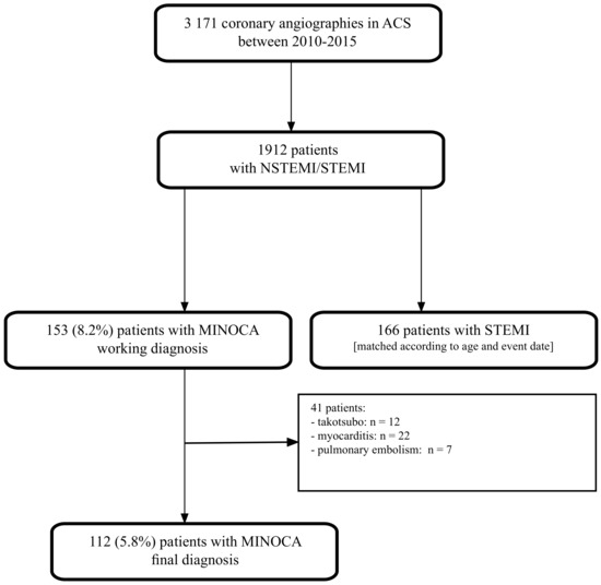 Study flowchart. ACS—acute coronary syndrome; NSTEMI—non-ST-elevation myocardial infarction; STEMI—ST-elevation myocardial infarction, MINOCA—myocardial infarction with non-obstructive coronary arteries.