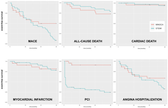 In our paper, we observed similar outcomes between MINOCA and STEMI at 5 years. One must also stress that the results were quite favorable, with low rates of all-cause death (5.4% vs. 4.2%), cardiac death (0.9% vs. 1.2%), recurrent myocardial infarction (3.6% vs. 4.2%) or MACE (11.6% vs. 18.7%). The rates of repeated hospitalizations due to angina in MINOCA and STEMI patients were 8.1% vs. 13.3%, respectively. The relative low incidence of comorbidities could have influenced this finding, with only 42% of patients having arterial hypertension, or 37% of patients having dyslipidemia in the STEMI group. However, as shown in the Supplementary Materials, the outcomes at the very long follow-up (median: MINOCA—9 years, STEMI—9.8 years) were much worse (all-cause death rate—17.9% vs. 24.1%, p = 0.61; cardiac death rate—9.8% vs. 16.9%, p = 0.31 and MI rate—14.3% vs. 21.1%, p = 0.41). Nevertheless, once again, no statistical difference was observed between the MINOCA and STEMI patients.