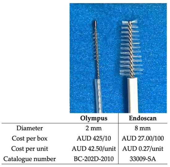 Olympus (left) and Endoscan (right) cytology brushes. The largest diameter of each brush, 2019/2020 cost and product catalogue number is recorded alongside each respective instrument.