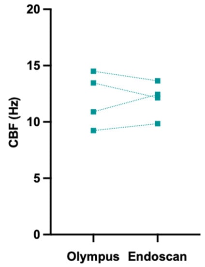 Cilia beat frequency (CBF) for nasal epithelial sheets collected with the Olympus and Endoscan brushes. Mean CBF measurements from nasal epithelial sheets obtained using both brushes for the same participant. Paired samples are connected using a dashed line, n = 4 participants.