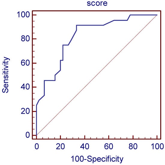 The scoring system in the retrospective analysis of the operating characteristics of the receiver showed an AUC of 0.82. (p < 0.0001).