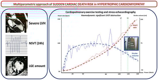 Beyond traditional ergometric tests, cardiopulmonary exercise testing (CPET) represents a valuable safety tool in all CMPs for assessment of functional capacity (NYHA Class quantification) and exertional arrhythmic risk as well as for differential diagnosis of angina and dyspnea. In particular, CPET allows differentiating between cardiac and non-cardiac causes of dyspnea as well as evaluating specific mechanisms of breathing discomfort in cardiac patients such as systolic or diastolic dysfunction, mitral regurgitation, chronotropic incompetence, or, as specifically in the case of obstructive HCM, low cardiac output due to significant inducible obstruction. Figure 4 shows a case of an HCM patient with severe LVH, NSVT, and myocardial fibrosis on CMR (right side) without significant LVOT obstruction at baseline that became significant during exercise (left side). More specifically, during exercise, stroke volume (blue line) begins to decline before the lactate threshold (LT) as a consequence of a progressive increase in the LVOT gradient of obstruction. Cardiac output is progressively sustained by heart rate only (red line) as a compensatory response; after the respiratory compensation point (RC), exercise was limited by dyspnea and hypotension associated with a gradient of obstruction of 74 mmHg (documented by echocardiography during exercise).