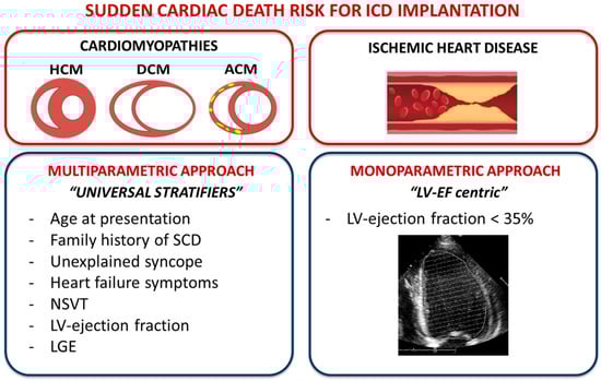Although the indication for ICD implantation in CAD remains strongly dependent on a single parameter, namely the left ventricular ejection fraction (LVEF) < 35%, in the universe of CMPs, SCD risk depends on several variables and requires a multiparametric and personalized evaluation, resulting therefore in a less “LVEF-centric” approach in which a pivotal role is still represented by the clinical and family history evaluations and in which genetics is showing an increasingly promising role.