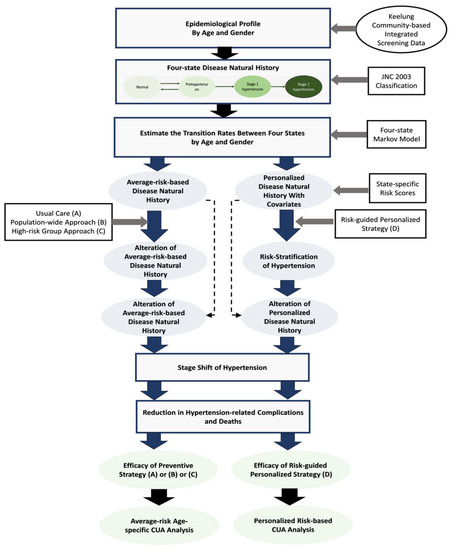 Intervention strategies including the population-wide universal approach, the population-based high-risk approach, and the personalized approach were evaluated for the prevention of hypertension. Considering the varying natural history of disease evolution in terms of the rates of progression and regression, the effectiveness of these intervention strategies was determined. The transition probability allows determining the shifting of the stages and the possible decrease in hypertension-related complications and fatalities. The effectiveness of the intervention strategies can be measured by comparing outcomes in terms of person-years gained and quality-adjusted person-years gained. The cost associated with the intervention strategies was then taken into account in order to perform a cost-utility analysis (CUA) economically.