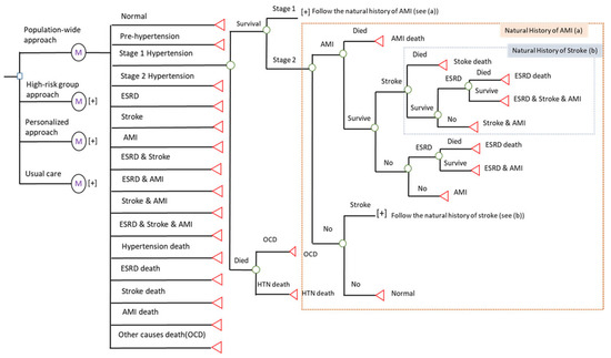 We used a decision node (□) to indicate the selected decision and used a chance node (◯) to show all possible outcomes with different probabilities. The symbol of [+] in Figure 2 denotes the subsequent tree for all events. In a Markov tree, the four-state natural history of hypertension was classified in normal state, pre-hypertension, stage I, and stage II. The Markov node (