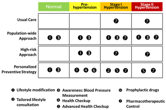 The four-stage hypertension progression with the four intervention strategies. The color indicates the disease risk from low to high.