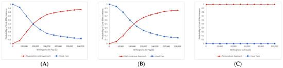 The acceptability curve for hypertension prevention. (A) Population-wide approach vs. usual care (B) High-risk group approach vs. usual care (C) Personalized approach vs. usual care.