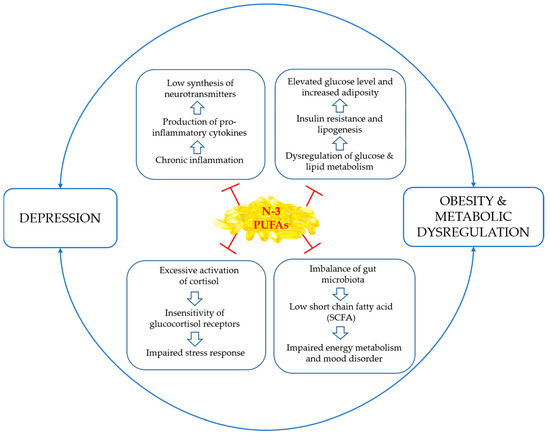 The co-occurrence of depression and obesity has become a significant public health concern worldwide. Recent studies have shown that metabolic dysfunction, which is commonly observed in obese individuals and is characterized by inflammation, insulin resistance, leptin resistance, and hypertension, is a critical risk factor for depression. This dysfunction may induce structural and functional changes in the brain, ultimately contributing to depression’s development. Given that obesity and depression mutually increase each other’s risk of development by 50–60%, there is a need for effective interventions that address both conditions. The comorbidity of depression with obesity and metabolic dysregulation is thought to be related to chronic low-grade inflammation, characterized by increased circulating levels of pro-inflammatory cytokines and C-reactive protein (CRP). As pharmacotherapy fails in at least 30–40% of cases to adequately treat major depressive disorder, a nutritional approach is emerging as a promising alternative. Omega-3 polyunsaturated fatty acids (n-3 PUFAs) are a promising dietary intervention that can reduce inflammatory biomarkers, particularly in patients with high levels of inflammation, including pregnant women with gestational diabetes, patients with type 2 diabetes mellitus, and overweight individuals with major depressive disorder. Further efforts directed at implementing these strategies in clinical practice could contribute to improved outcomes in patients with depression, comorbid obesity, and/or metabolic dysregulation.