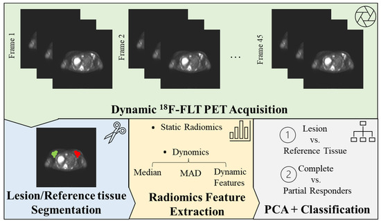 Radiomics Workflow. Beginning with the acquisition of medical images, volumes of interest (VOIs) are manually segmented on both the lesions and a healthy reference tissue. Radiomic features are subsequently extracted from these VOIs and superimposed onto the static 18F-FLT PET image (a 3D image derived from averaging the final five time-frames of the dynamic acquisition), thus establishing the basis for static radiomics. For our novel dynomics approach, these features are extrapolated from each frame of the dynamic 18F-FLT PET acquisition. In this process, summary values—including median and median absolute deviation (MAD)—are evaluated for each feature and analyzed in conjunction with their temporal evolution (dynamic features). The features encapsulate information about the tumor’s shape, first-order statistical features (derived from the image intensity histogram), and second-order statistical features (texture features). To optimize the data for interpretation, radiomics features undergo redundancy correction via principal component analysis (PCA), enabling the analysis of only non-redundant, meaningful features. These streamlined features are then processed through a machine learning model (XGBoost), generating a clinically interpretable outcome (lesion vs. reference tissue and complete vs. partial responders’ classification).