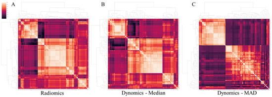 Feature correlation matrices, demonstrating high redundancy across the original static (A) and median (B) and mean absolute deviance (MAD) (C) of the dynamic radiomic features.