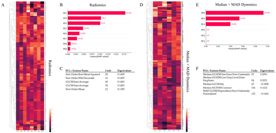 PCA and SHAP analysis for radiomics and median + MAD dynomics. Given the substantial intercorrelation among variables, principal component analysis (PCA) was employed to condense the dimensionality of static radiomics to eight principal components for tumor vs. reference tissue comparison and median + MAD dynomics to six principal components for CR vs. PR classification. For all PCA procedures, extraction was configured to account for 90% of the total variance in the respective dataset. SHapley Additive exPlanation (SHAP) was utilized to quantify the contribution of each principal component, derived through PCA, to the classification model. (A,D) The heatmaps illustrate, for each principal component used to classify tumor vs. reference tissue using radiomics (A) and PR vs. CR employing median + MAD dynomics (D), the clustered eigenvalues evaluated for each feature. (B,E) These are variance importance plots detailing the most significant principal components, listed in descending order, contributing to the classification of tumor tissues using radiomics and PR using median + MAD dynomics. PC1 and PC6 were the most substantial contributors to each classification task, respectively. (C,F) These depict the top five features that load the highest on the component contributing the most to the classification task (radiomics—PC1 for tumor vs. reference tissue classification, and median + MAD dynomics—PC6 for CR vs. PR classification), along with the total explained variance.