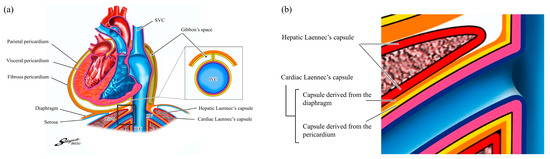 Liver anatomy based on Laennec’s capsule (adapted from reference [14]): (a) The cardiac Laennec’s capsule is derived from the pericardium (parietal and visceral) and diaphragm and covers the tunica media of the inferior vena cava and hepatic veins; (b) Enlarged image of the area within the white dotted line in (a). HV, hepatic vein; IVC, inferior vena cava; SVC, superior vena cava.
