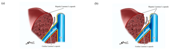 Kiguchi et al. demonstrated novel techniques using these two membranes: the inter-Laennec (Figure 2a) and outer-Laennec approaches (Figure 2b) [12,13]. These techniques can be performed by exposing the hepatic vein from the root side.