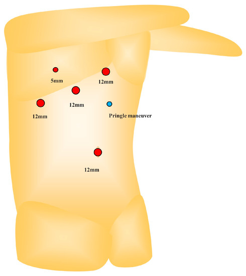 The patient was placed in a left semi-lateral position using five trocars: a 12 mm trocar at the umbilicus for the laparoscope, three 12 mm trocars in the right subcostal arch, and a 5 mm intercostal trocar through the 8th intercostal space (Figure 5). A 5 mm tape for the Pringle maneuver was placed on the left side of the upper abdomen. The pneumoperitoneum pressure was set to 10 mmHg. The operator stood on the patient’s left side.