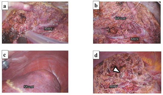 Following the identification and marking of the MHV using intraoperative ultrasonography (IOUS), liver parenchymal transection was initiated at the ventral aspect of the root of the MHV using the outer-Laennec approach (Figure 6a). The MHV was continuously exposed from the root to the periphery using a Cavitron ultrasonic surgical aspirator (CUSA). This exposure direction of the hepatic vein can prevent split injuries. The G8vent was identified on the right side of the MHV. Following the encircling of the G8vent (Figure 6b), it was temporally clamped, and the ischemic area was confirmed as a transection line (Figure 6c). Following G8vent dissection, the resected side of the liver was retracted upward to the right by an assistant, and liver parenchymal transection was completed by connecting the demarcation line and G8vent stump (Figure 6d). Specimens were removed through the umbilical incision and placed in a plastic bag. The MHV and G8vent stump were exposed on the cut surface. A drainage tube was placed on the cut surface.