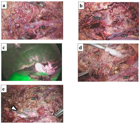 Following the identification and marking of the AFV using IOUS, liver parenchymal transection was initiated at the ventral aspect of the root of the MHV. The confluence of the AFV and MHV was confirmed, and the AFV was continuously exposed by the CUSA from the root to the periphery (Figure 7a). The G8dor was identified at a deeper location on the right side of the AFV (Figure 7b). The G8dor was temporally clamped, and the ischemic area was confirmed to be a transection line (Figure 7c). Liver parenchymal transection was continued to the ventral side of the IVC, and the paracaval branch was dissected. Behind the dissected paracaval branch, the RHV was exposed from the root via the outer-Laennec approach (Figure 7d). Following G8dor dissection, liver parenchymal transection was completed by connecting the demarcation line and RHV. Specimens were removed through the umbilical incision and placed in a plastic bag. The AFV, RHV, and G8dor stump were exposed on the cut surface (Figure 7e). A drainage tube was placed on the cut surface.