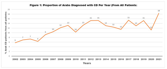 Proportion of Arabs diagnosed with CD per year (from all patients).