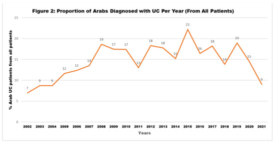 Our data showed a continuous increase in the proportion of Arab IBD patients among all patients diagnosed in the same year, for both CD and UC, as seen in Figure 1 and Figure 2.