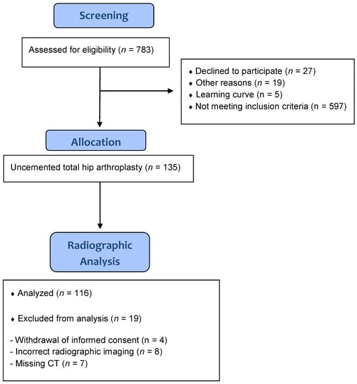 In the course of a registered, prospective controlled trial (DRKS00000739, German Clinical Trials Register), low centered anteroposterior pelvic radiographs were obtained postoperatively from patients undergoing THA. This investigation was approved by the local ethics commission (No. 10-121-0263). The current study is a secondary analysis of a larger project [8]. The primary outcome of this study was to assess whether the artificial joint’s range of motion could be improved with a computer-assisted, functional optimization of the cup position and cup containment. A consecutive series of 783 patients with osteoarthritis of the hip was screened. The inclusion criteria were the following: age between 50 and 75 years, an American Society of Anesthesiologists (ASA) score ≤ 3, unilateral osteoarthritis of the hip (up to Kellgren 2 on the contralateral side), no prior hip surgery and no hip dysplasia or trauma. In total, 597 patients did not meet the inclusion criteria, 27 patients declined participation in the study, and another 19 patients could not be included for other reasons (e.g., cancellation of the operation or increased inflammatory factors during a blood examination the day before surgery). In total, a consecutive series of 135 patients was enrolled in this single center study. Nineteen patients had to be withdrawn from the current study. Four patients withdrew their informed consent and refused further participation in the study as well as use of their data. In seven data sets, no postoperative CT was available, and in eight cases, there was an obvious rotational error on the postoperative radiograph. In total, the records of 116 THAs were included for final analysis (Figure 1). The characteristics of the study group are shown in Table 1.