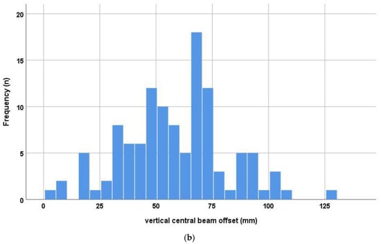 Figure 3. Histograms of horizontal (a) and vertical (b) central beam offset in the study group.