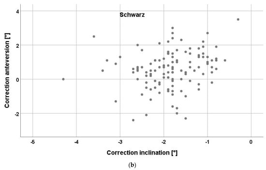 Figure 4. Scatter plot of the impact of parallax effect on cup inclination and anteversion according to Derbyshire (a) and Schwarz (b) correction.