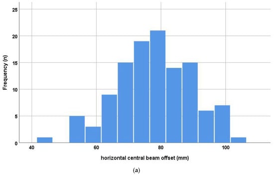 Histograms of horizontal (a) and vertical (b) central beam offset in the study group.