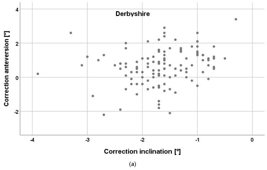 Scatter plot of the impact of parallax effect on cup inclination and anteversion according to Derbyshire (a) and Schwarz (b) correction.