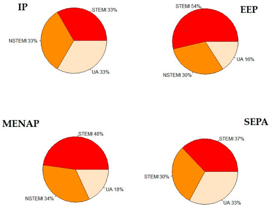 We find no statistical difference between the four groups in Unstable Angina (UA) (Figure 2a) and Non-ST Elevation Myocardial Infarction (NSTEMI) (Figure 2b) presentation rates. We observe a significant prevalence of ST Elevation Myocardial Infarction (STEMI) (Figure 2c) presentation in EEP and MENAP compared with IP (Figure 2c); otherwise, no difference is found between IP and SAP.