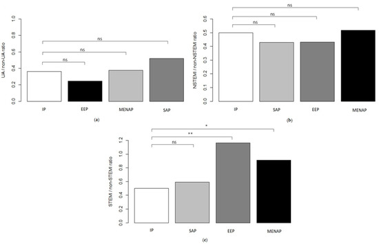 Ratio Admission Acute Coronary Syndrome (ACS) population characteristics. IP = Italian patients; EEP = East European patients; MENAP = Middle Eastern and North African patients; SAP = South Asian patients; NSTEMI: Non-ST Elevation Myocardial Infarction; STEMI: ST Elevation Myocardial Infarction; and UA: Unstable Angina. (a) UA/non-UA ratio. (b) NSTEMI/non NSTEMI ratio. (c) STEMI/non STEMI ratio. ns = not significant (* p < 0.05 and ** p < 0.001).